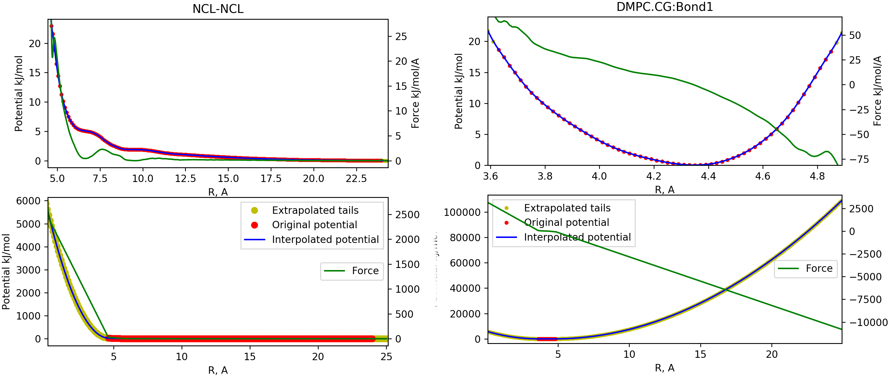 The molecular dynamics simulation heavily relies on quality of the tabulated potentials, i.e. the potential and force should be smooth and do not have discontinuities at the whole range